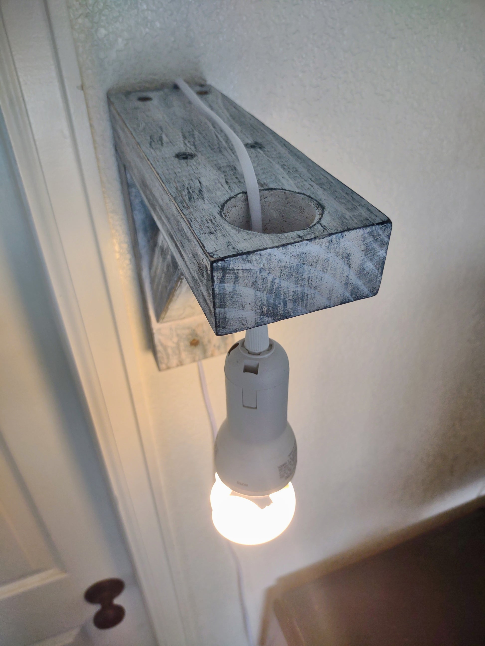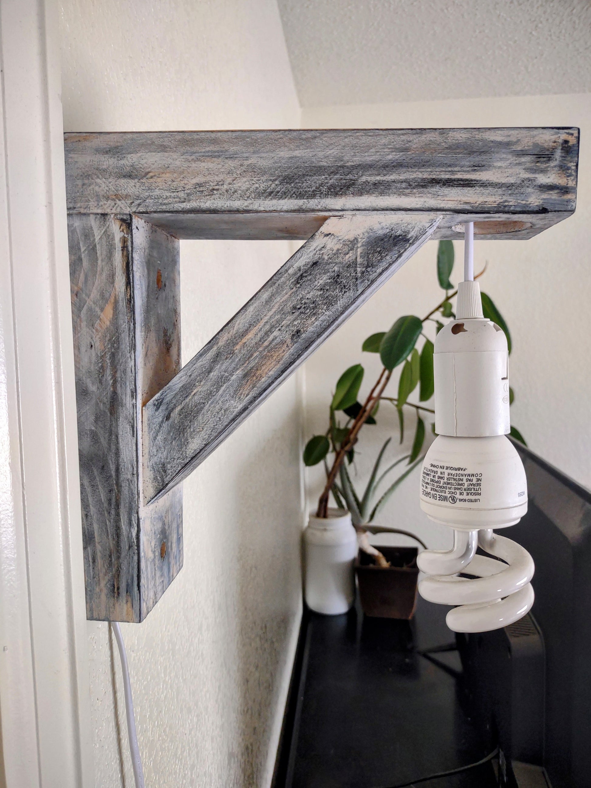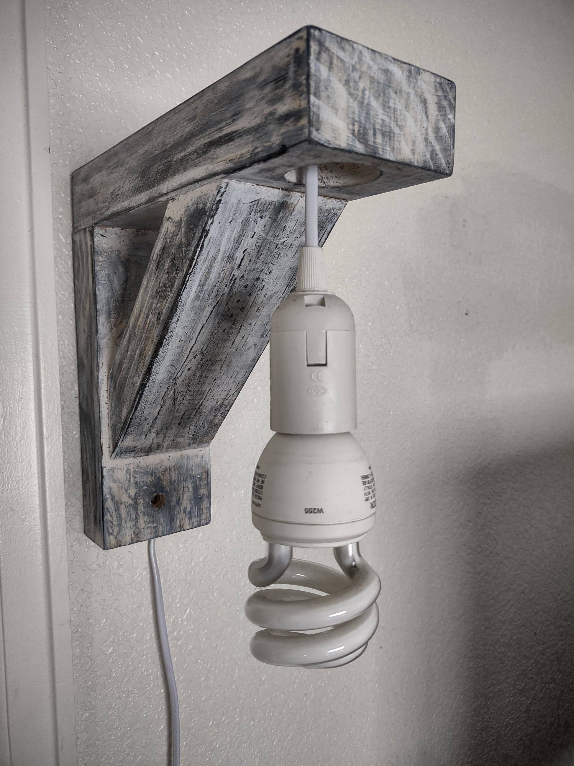 Primitive Country Cottage style wooden corbel lamp. 9" tall x 9" wide. Mounting screws and lightbulb not included.