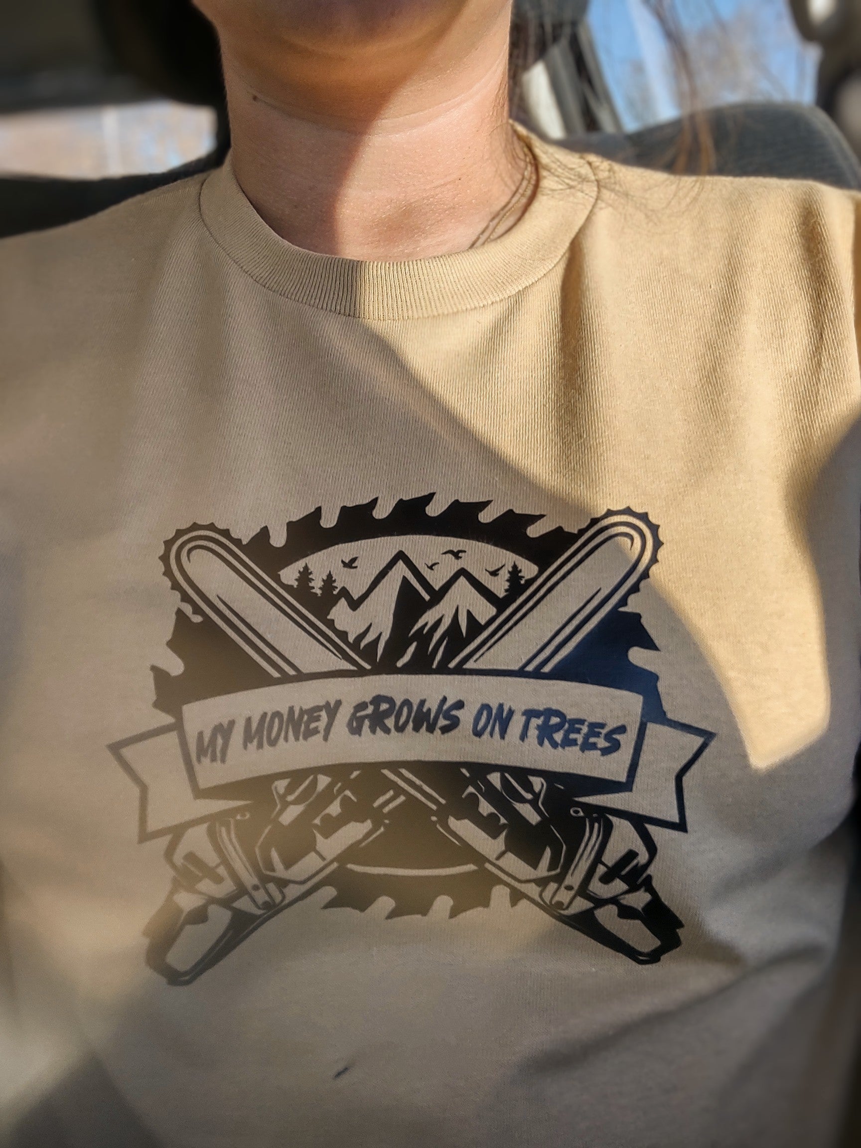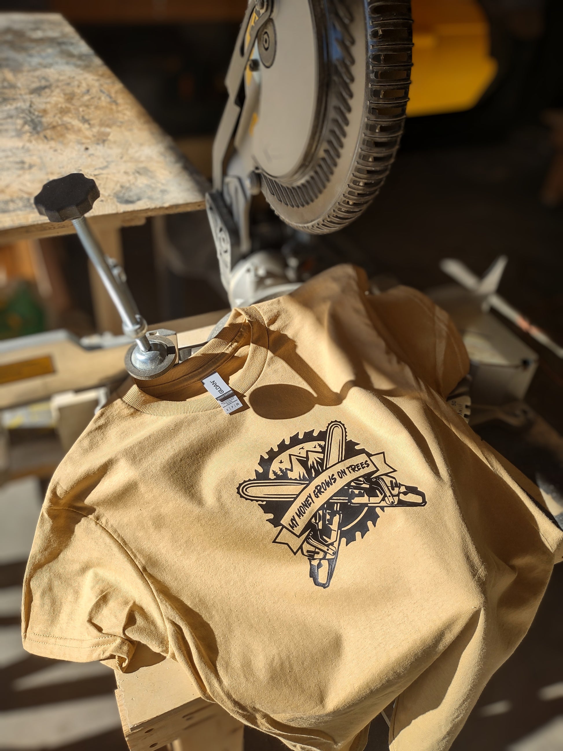 The PERFECT shirt for anyone who works with wood. Sizing is a comfortable fit for both men and women. Made from 100% cotton.