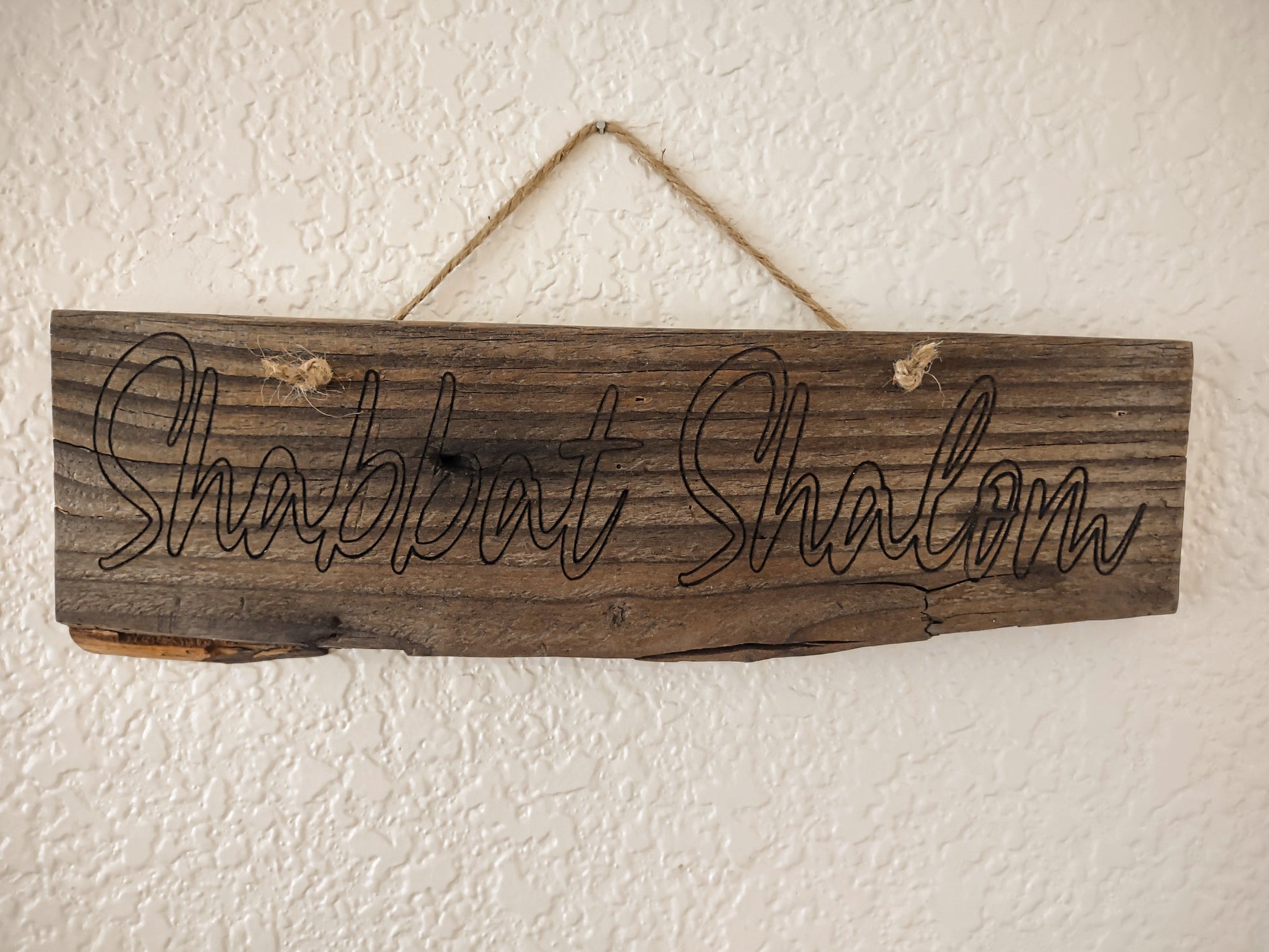 "Shabbat Shalom" engraved wooden sign with twine hanger.