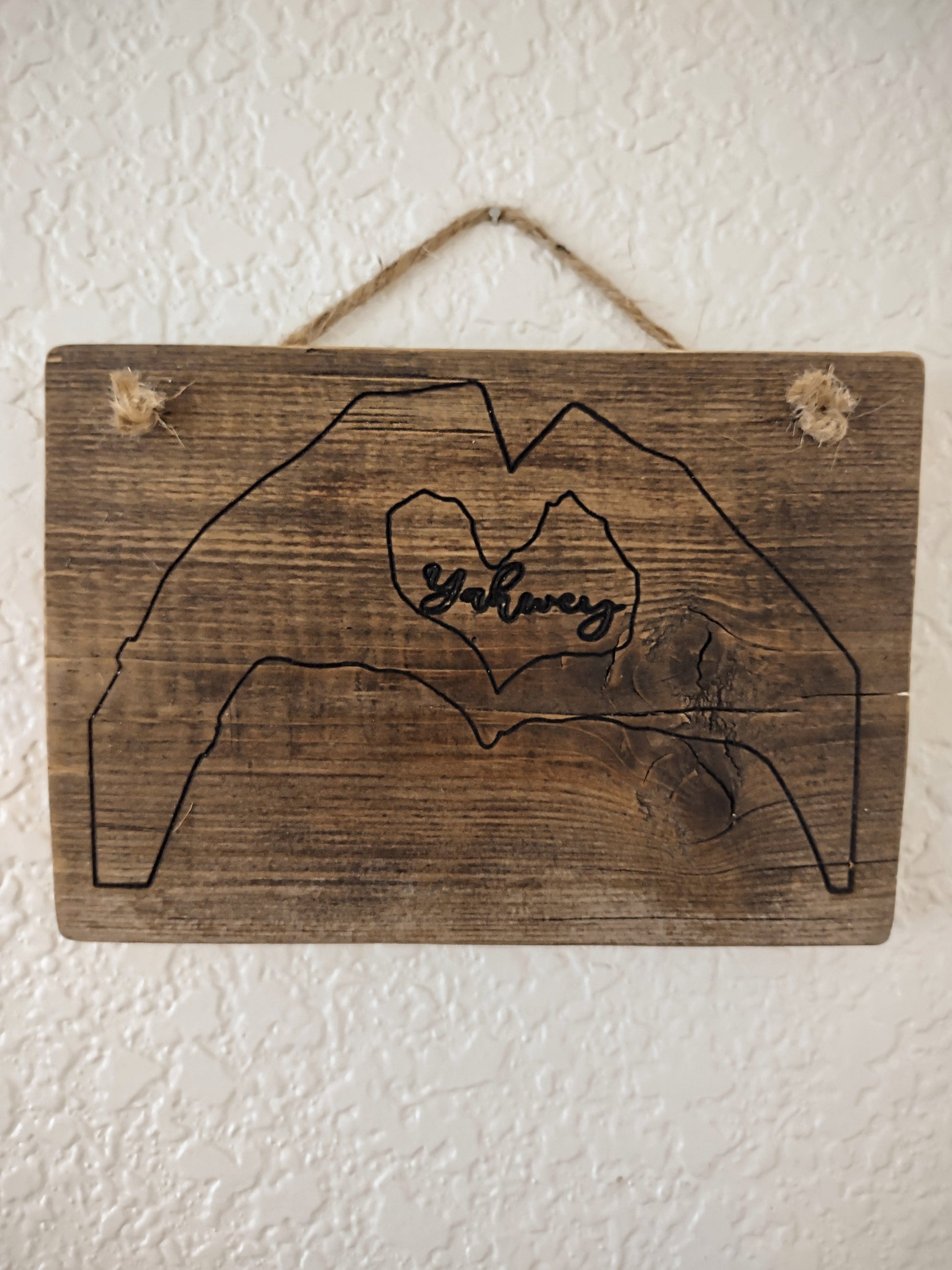 Outline of hands in a heart shape with "Yahweh" engraved wooden sign with twine hanger.