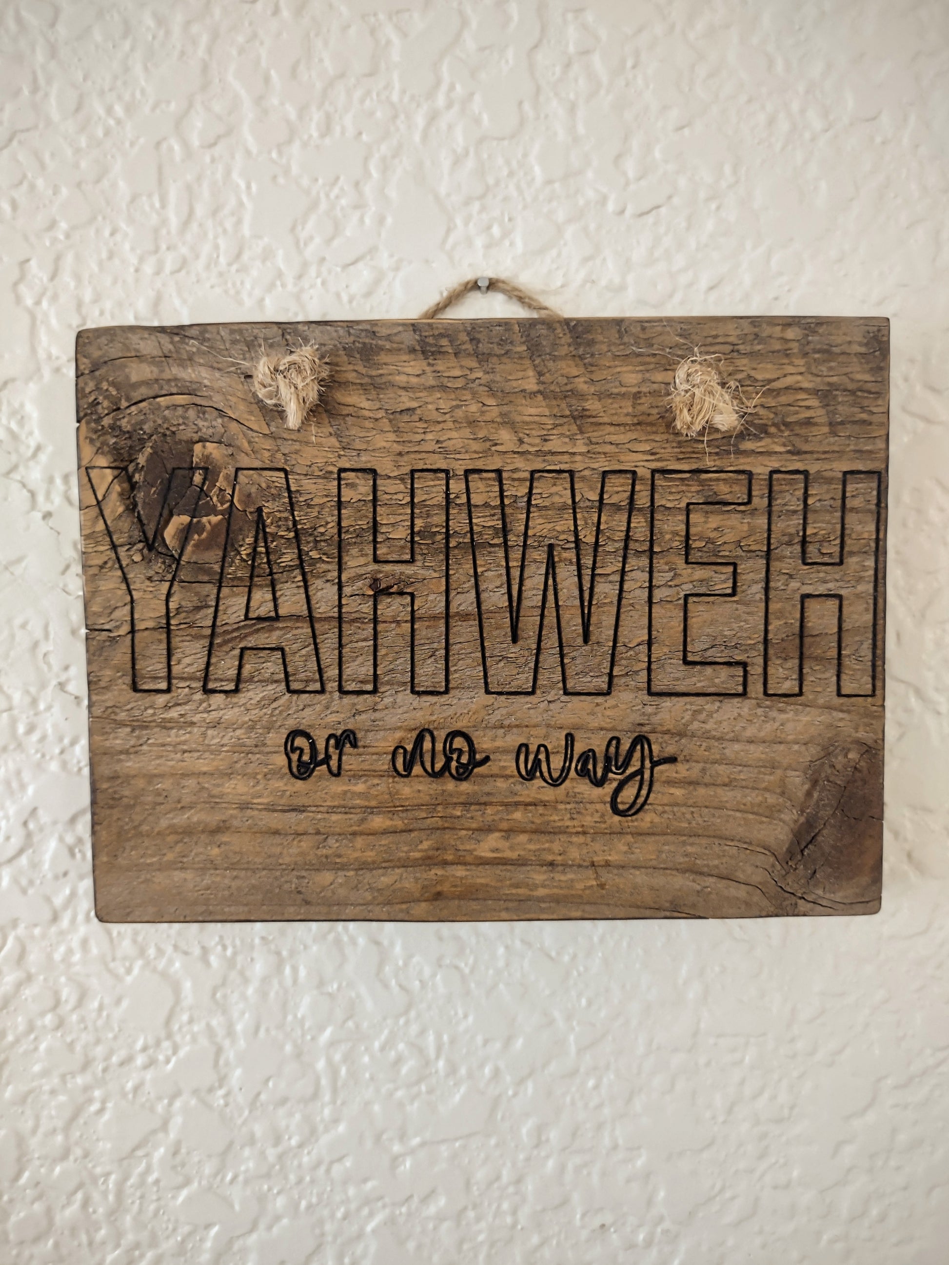"YAHWEH or no way" engraved wooden sign with twine hanger.