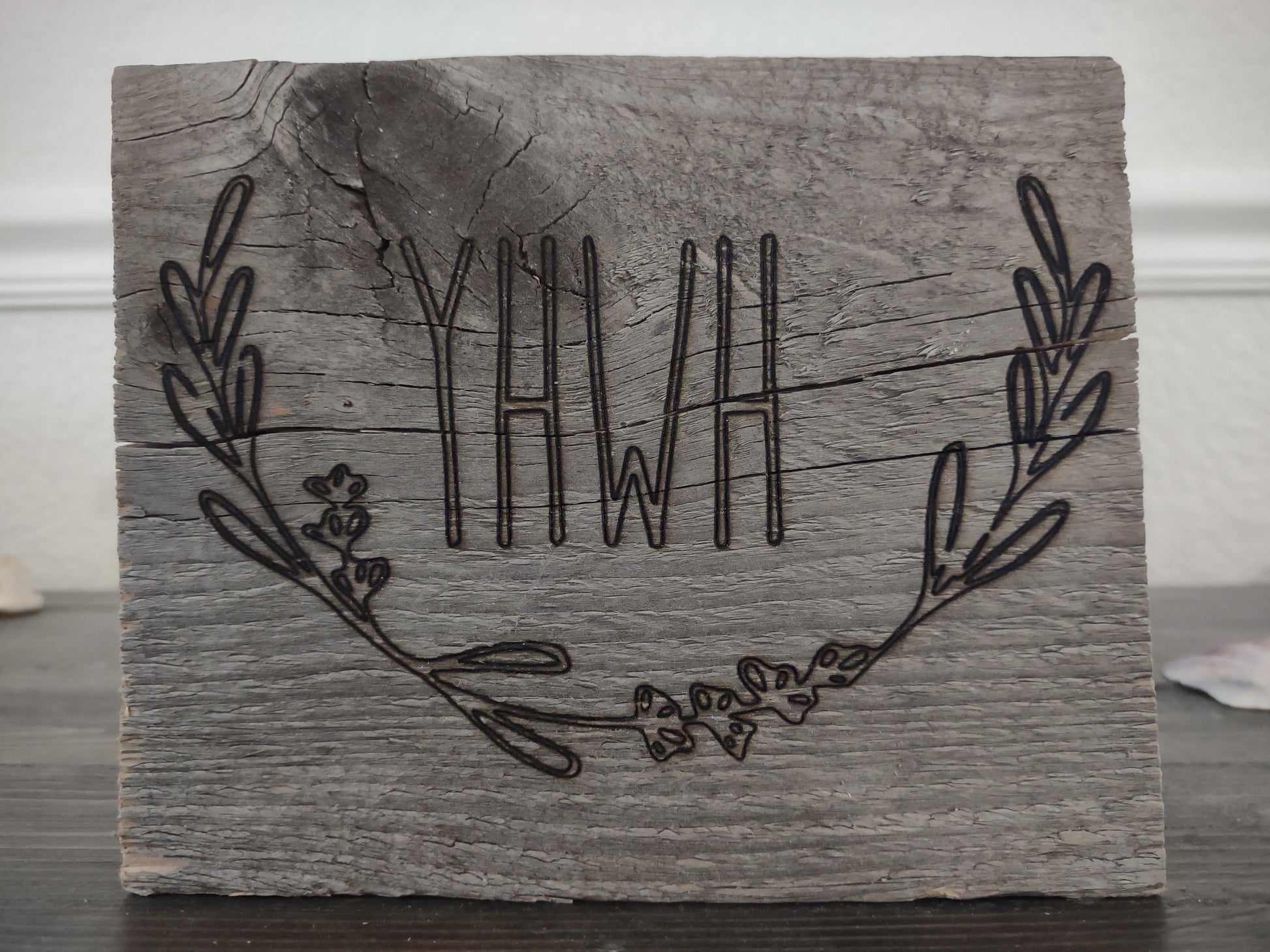 Half wreath with "YHWH" engraved wooden sign with twine hanger.